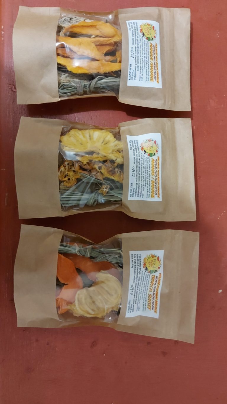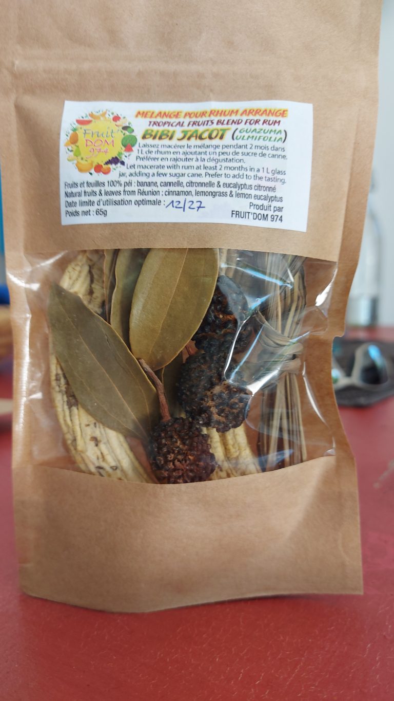 Au départ, des fruits gaspillés m’ont fait réfléchir à une transformation alimentaire à la filiale inexistante, le séchage de fruits décliné en fruits à déguster à la main, d’autres étant mélangés au zerbag péi (grains lontan y compris) sous forme de mélanz pour les rhums arrangés, faciles à transporter et ne diluant pas les rhums avec l’eau des fruits. Un produit devenu un bestseller depuis quelques années.