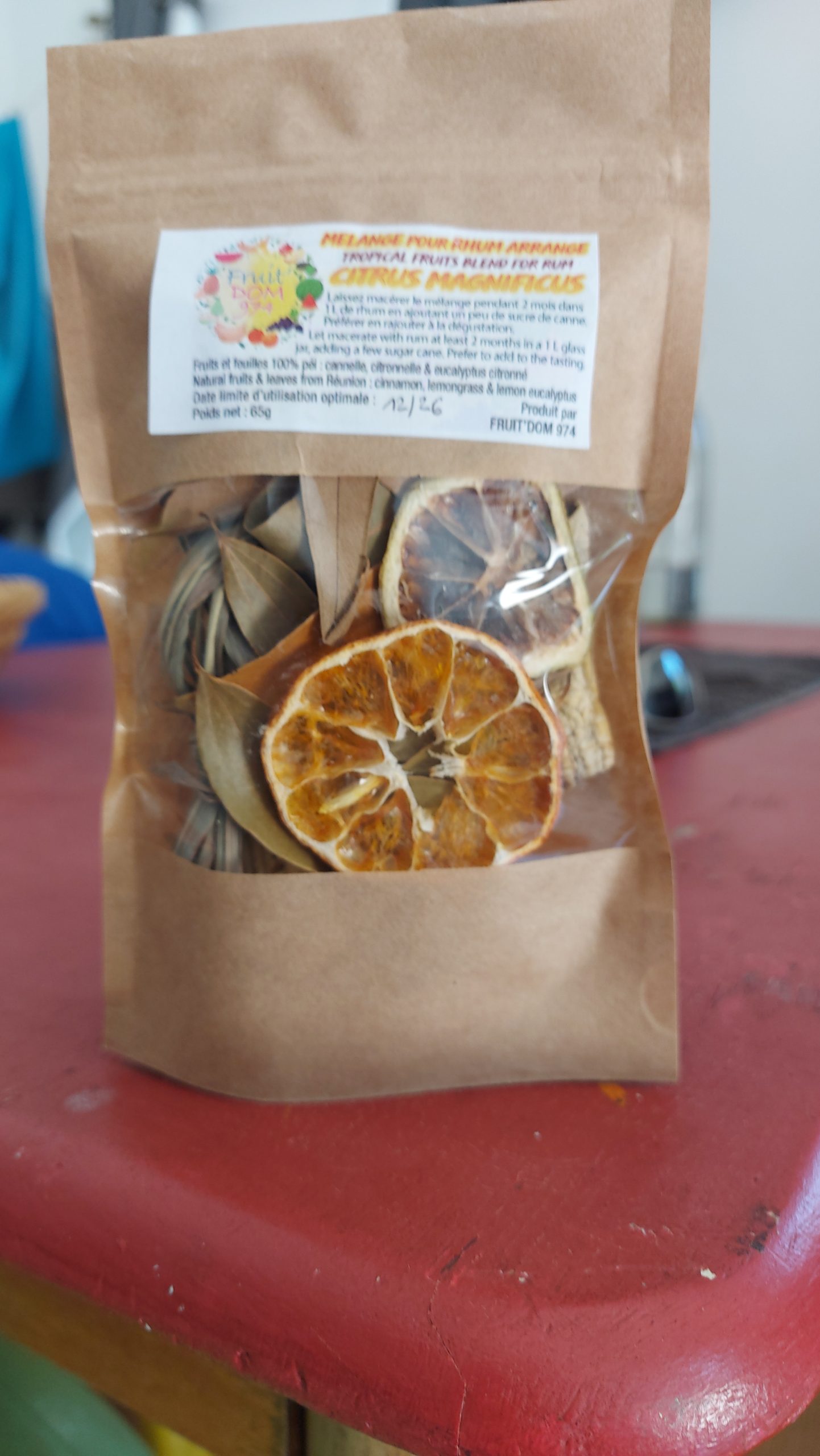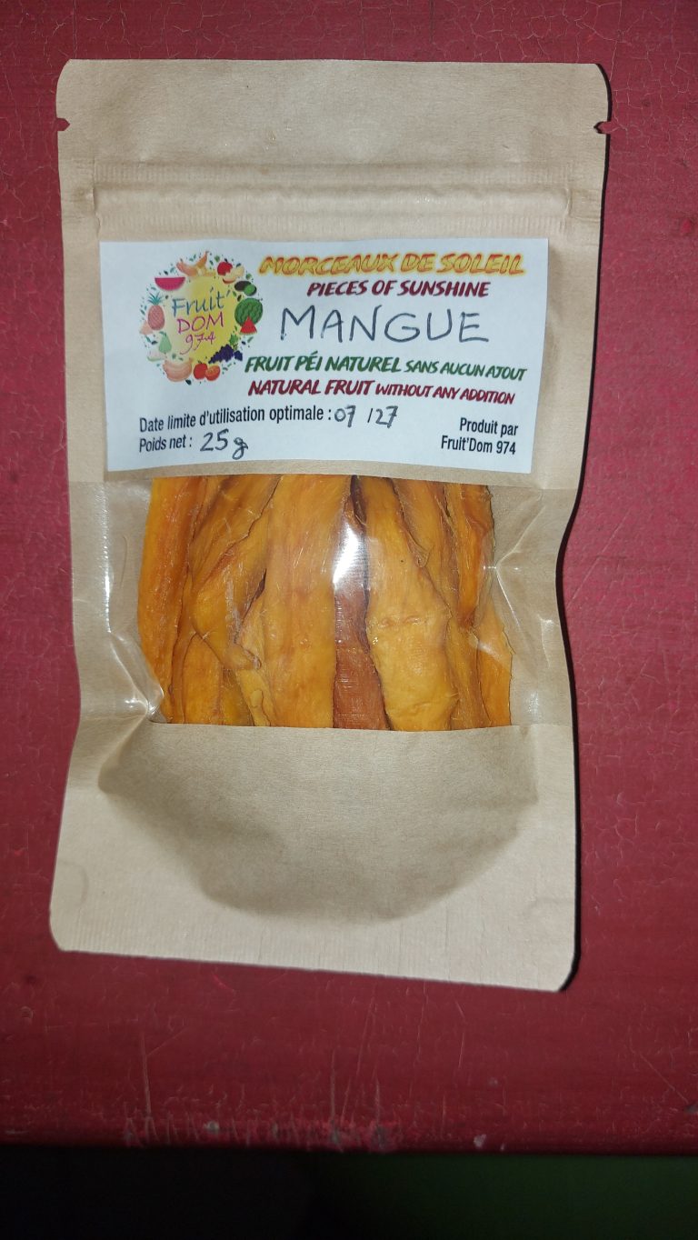 Née à Mayotte sous le nom de Fruit Dom976, une fois arrivé ici, j’ai pris le nom de Fruit Dom974 et me suis enrichie de nouvelles rencontres : des fruits, grains, la pharmacopée créole et ses plantes qui m’ont incitées à décliner de nouveaux mélanz locaux, dits péi. Ainsi que des fruits à déguster séchés, tel le pitaya qui, pour sûr, votre palais bluffera.